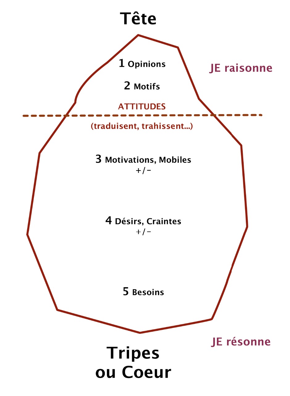 Dans mes échanges verbaux avec autrui, je livre d’abord, au niveau superficiel, mes opinions : ce que je pense… de la pluie, du beau temps, le café du commerce, bref les banalités, que l’on peut appeler «l’écume de la crête de la vague du comportement». Elles sont faciles à formuler. Je peux au besoin en changer pour animer une conversation ou un débat, sans pour autant me sentir impliqué. Peu de ma personne passe à travers les opinions que je formule.